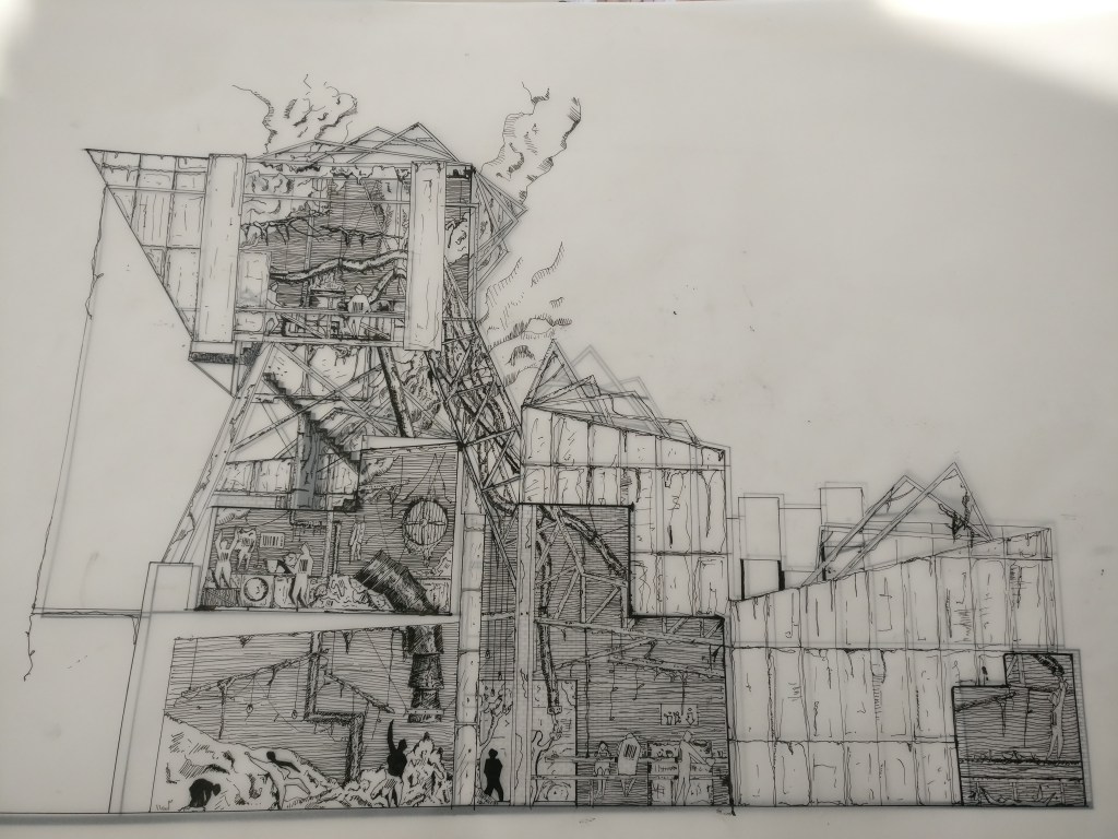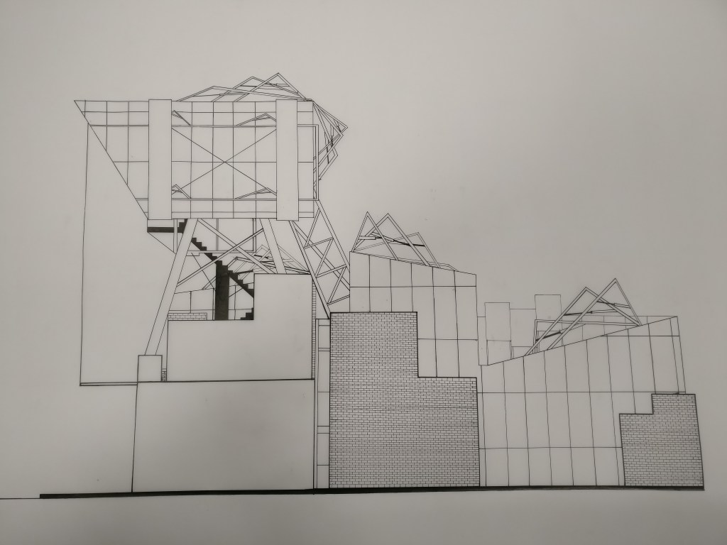 This first year project focused on designing a building within Folkestone that served the community. When researching the local social atmosphere within Folkestone I was surprised at how much class difference and gentrification there was within the area. Due to this I wanted to design a soup kitchen in which everyone is equal. To do this one must wear an overall that is all the same to remove prejudice over the way one dresses. And is supplied the same soup to everyone else. Via a heightened kitchen and delivery system. So that the workers are very much separated from the customers. People sit all at the same table and are treated all equally. With the same self service. This module was all hand drawn.Existing Building Survey. Elevations of the current site.1:200 section of siteElevation of proposed buildingSection of proposed building.